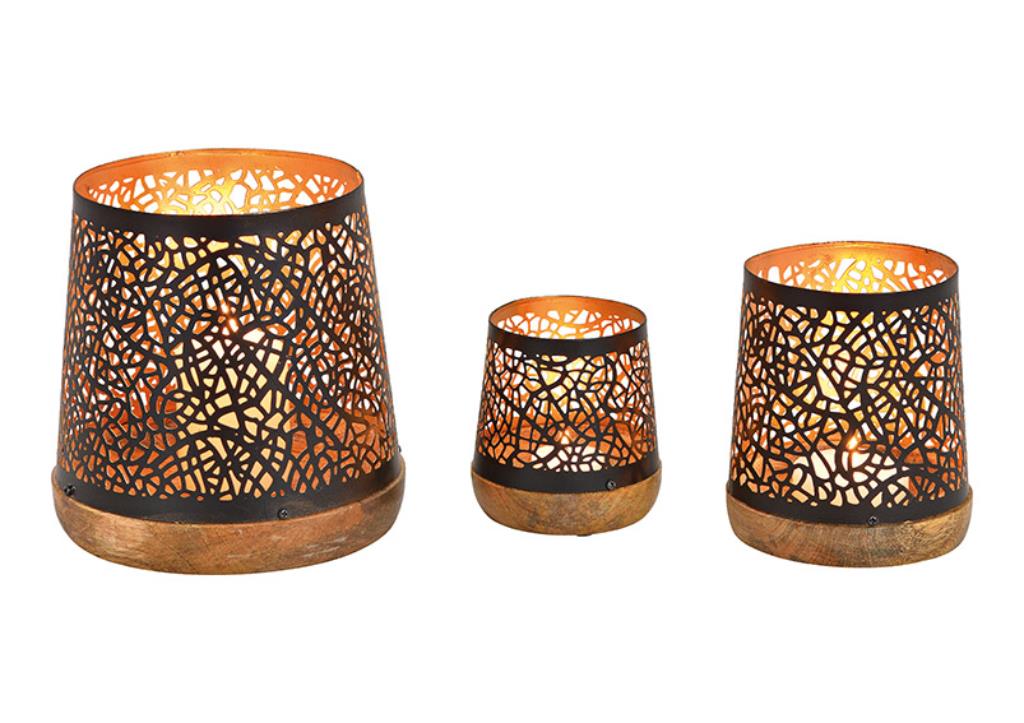 WURM Windlicht Set aus Metall auf Mangoholz Sockel Schwarz, gold 3er Set