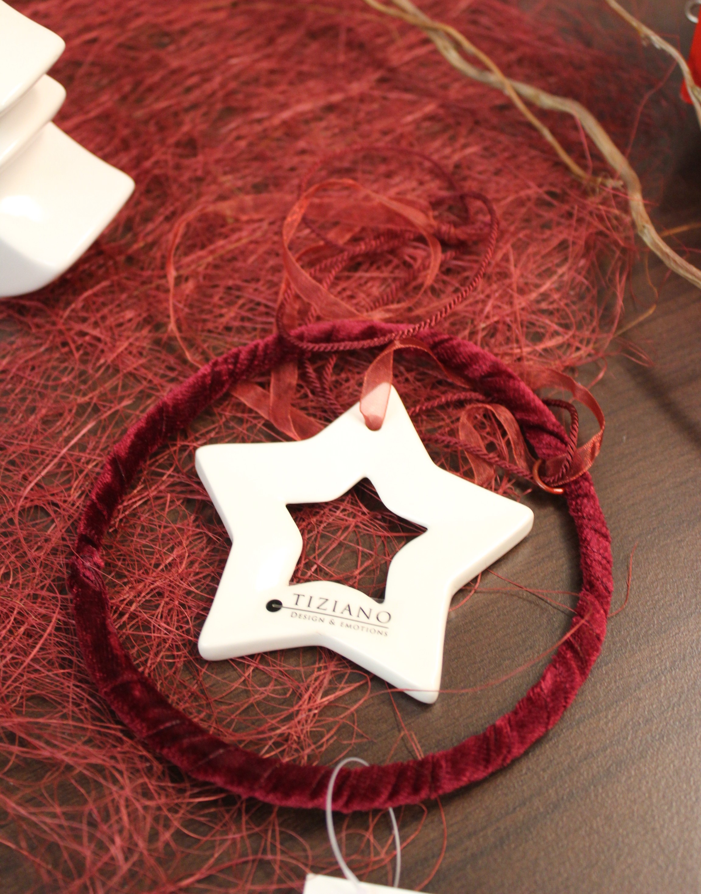 Der kreisförmige Anhänger ist mit einem auffälligen Samtband in der Farbe bordeaux rot umwickelt. Im Inneren des Hängers hängt ein Stern aus cremefarbener, glasierter Keramik.